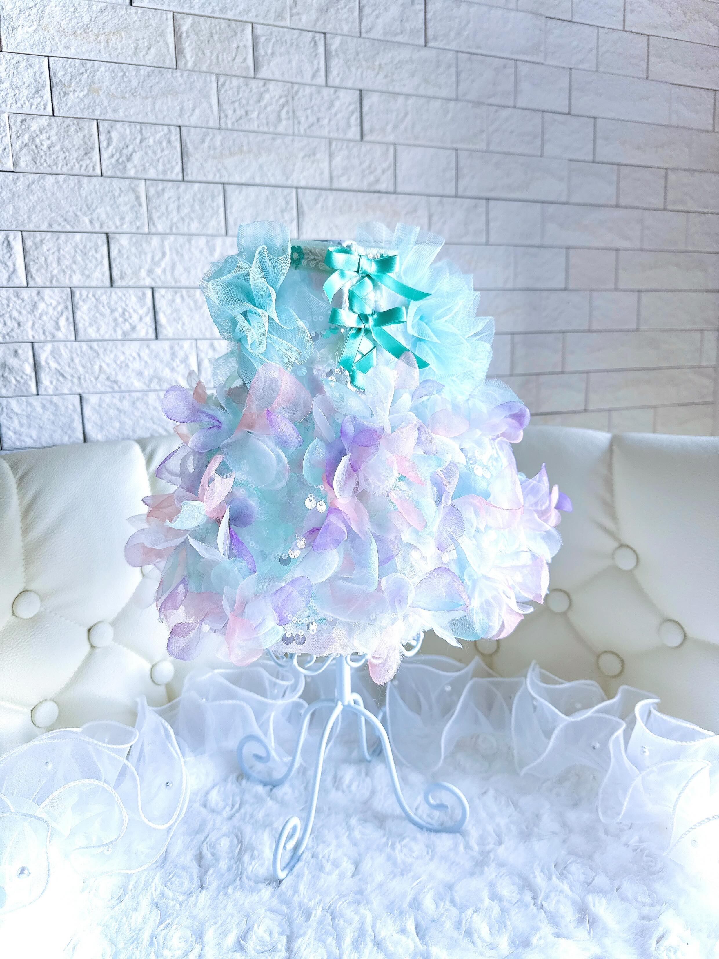オーガンジーや様々な素材が重なって1着のドレスに仕立てられます