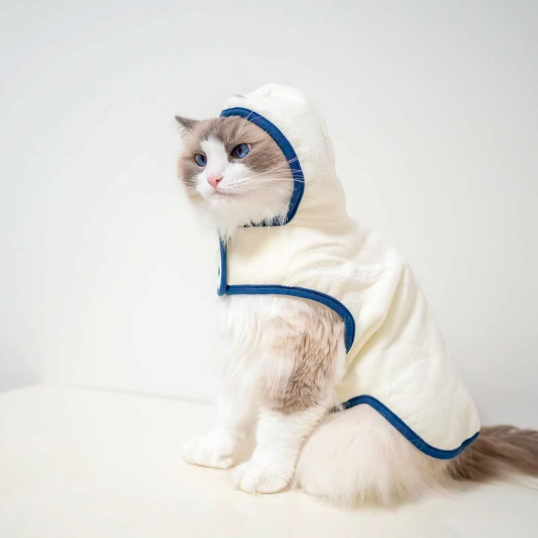 A cute poncho-style bathrobe in three colors that is gentle on the delicate skin of your cat